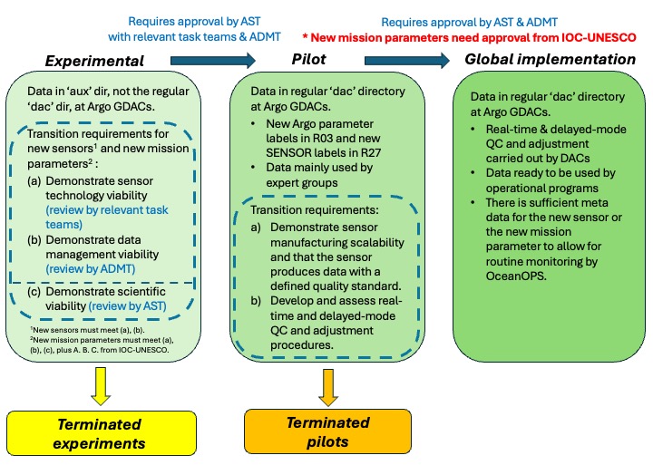 A document has been created to describe the pathway for admitting new sensors and mission parameters into Argo through these three phases. While following IOC-UNESCO guidelines for new parameters, it extends to include new sensors with additional considerations for the Argo data system to prevent unnecessary burden. The framework acknowledges that not all experimental work will advance to pilot or global phases, providing transparency about required procedures and practical guidance for each development stage.